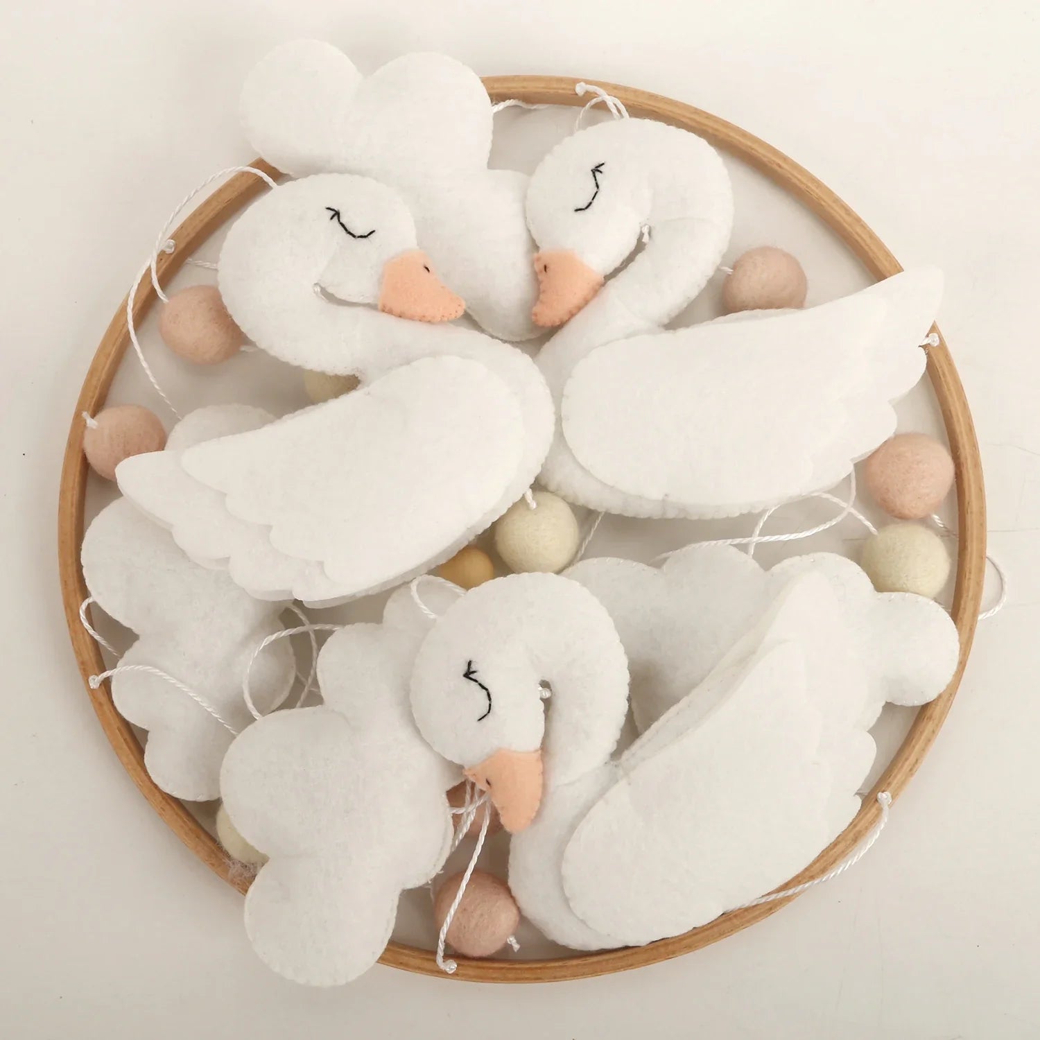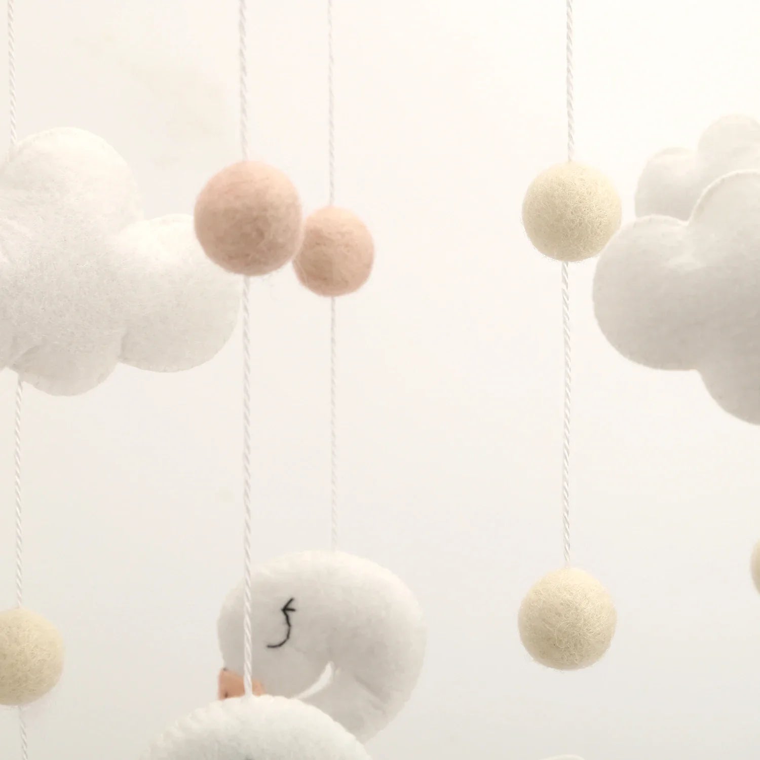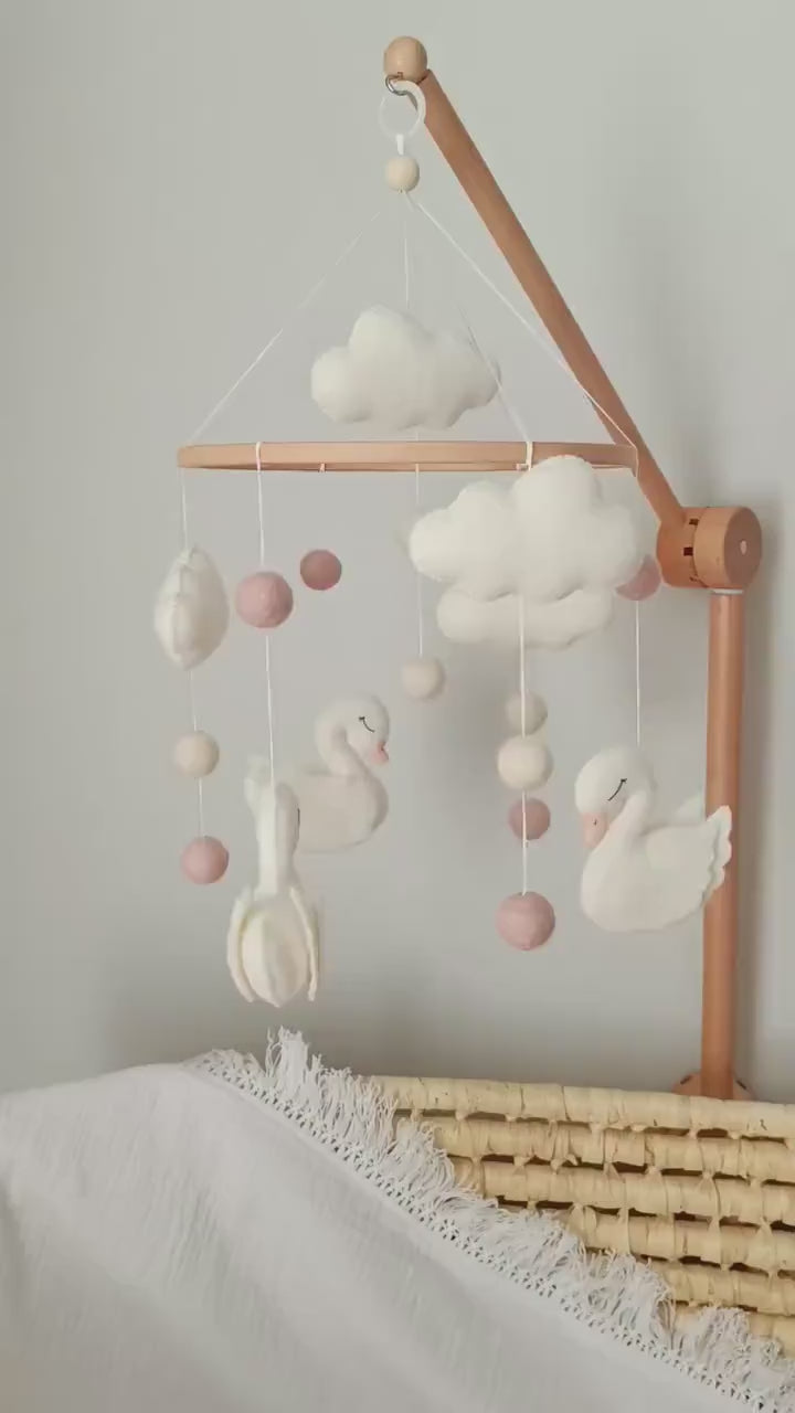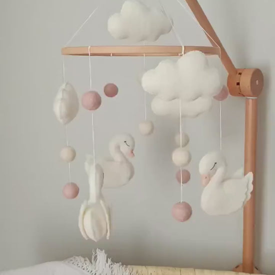 Soft, serene, and beautifully handcrafted, this felt baby mobile brings a gentle sense of calm to any nursery. Delicate white swans drift peacefully beneath fluffy felt clouds, accompanied by soft pastel wool balls that float like tiny dreams in the air. Each element is carefully made with subtle textures and muted tones, creating a soothing visual rhythm that’s perfect for little eyes to follow.